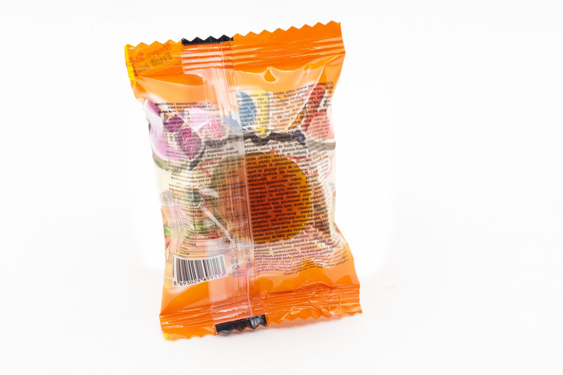 глюкозный сироп, сахар, фруктовый сок (яблочный 7%), желатин, сироп глюкозно-фруктозный, регуляторы кислотности (лимонная кислота, цитрат натрия), ароматизаторы (клубника, виноград, лимон, персик), красители (антоцианы, хлорофилл и хлорофиллин медный комплекс, куркума, экстракт паприки), глазурь (карнаубский воск, пчелиный воск, растительный жир (пальмовый)).