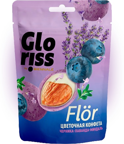 Миндаль в белой шоколадной глазури Gloriss by Biennale Florс черникой и лавандой 65 гр130,00 руб. за штуку (в упак. 16 шт.) |